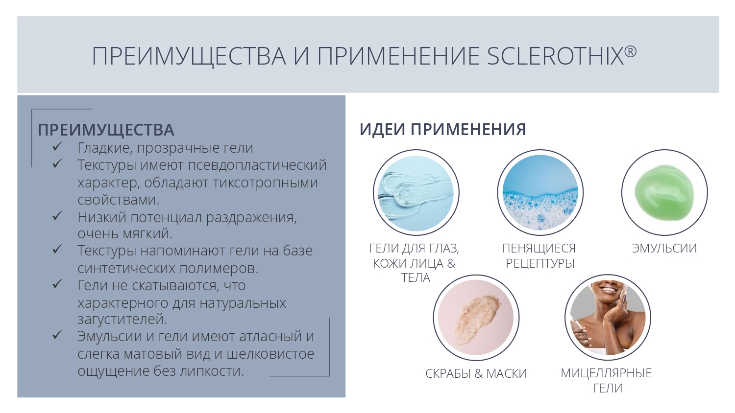 Sclerothix является эффективной добавкой для улучшения суспендирования (подвешивания) различных частиц - скрабов, глин или пигментов, в том числе в составе моющих систем.